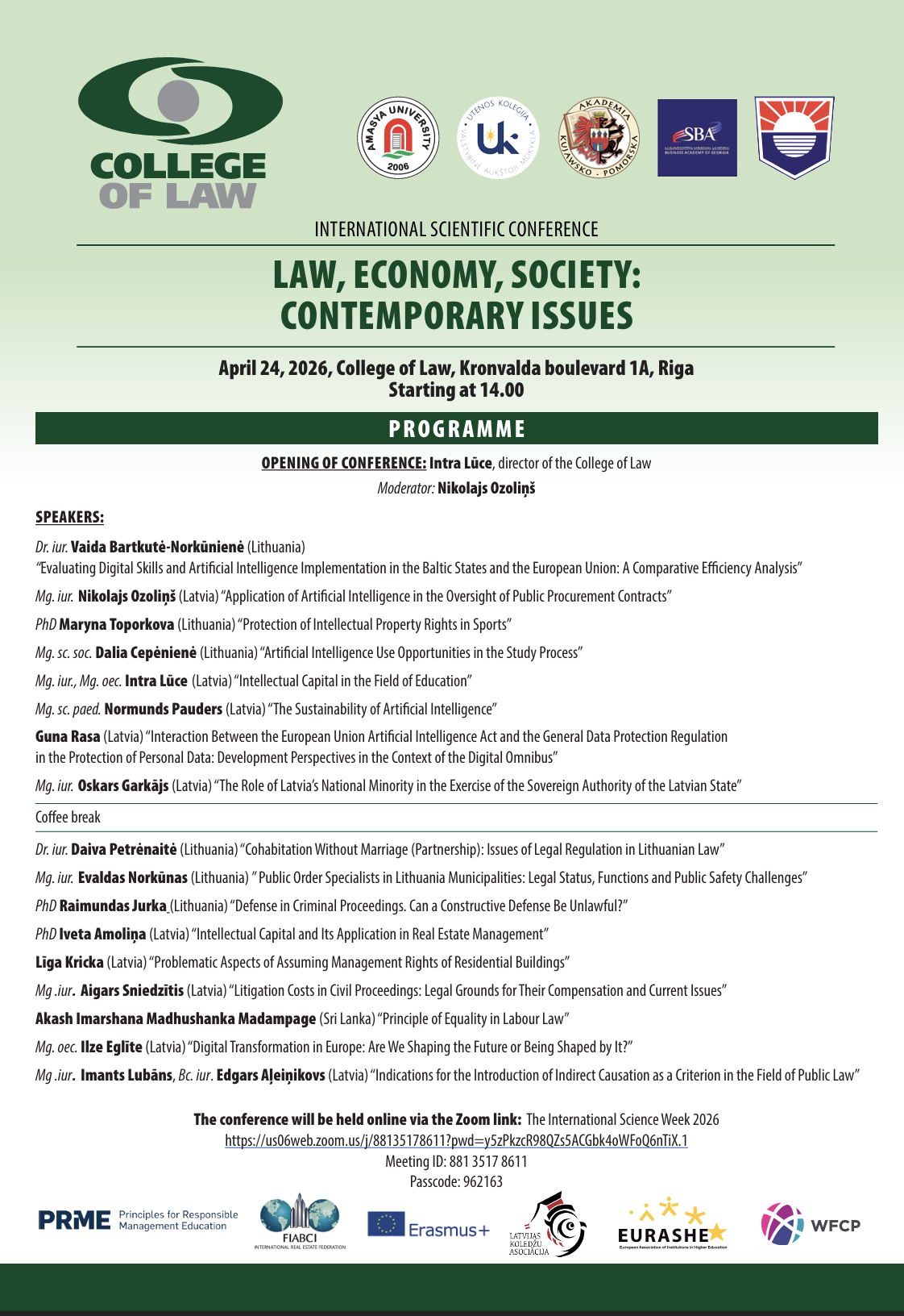 – from 18 May until 22 May, 2026 on- site, at the College of Law (Juridiskā koledža) in Riga (face– to–face);